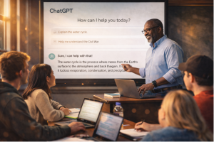 An AI generated photo of a college professor teaching students how to utilize ChatGPT as an academic tool.